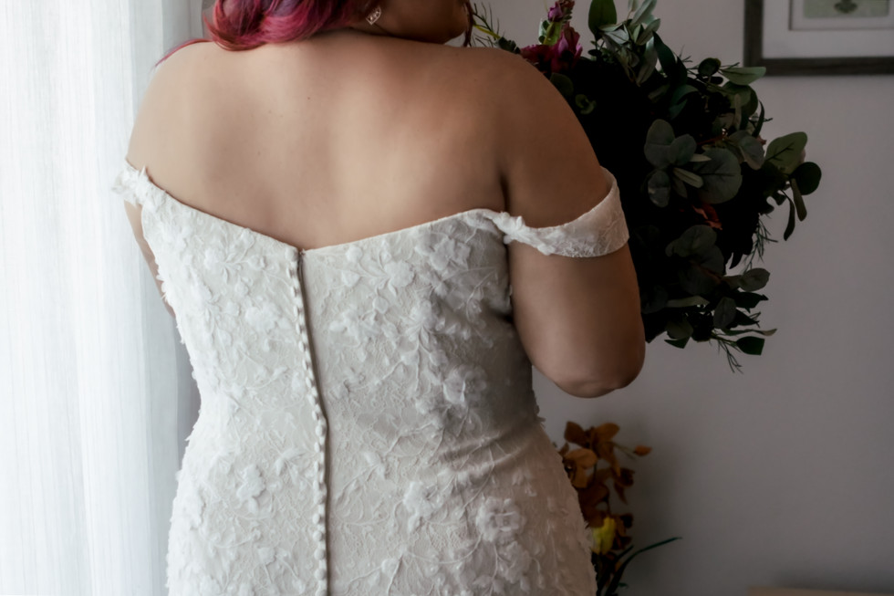 Mientras la pareja se preparaba para su gran día, sus suites estaban llenas de familiares y amigos. El cuarto de hotel tenía una enorme ventana que proporcionaba una hermosa iluminación, las condiciones perfectas para fotos de boda de Joanna con su exquisito traje de novia.