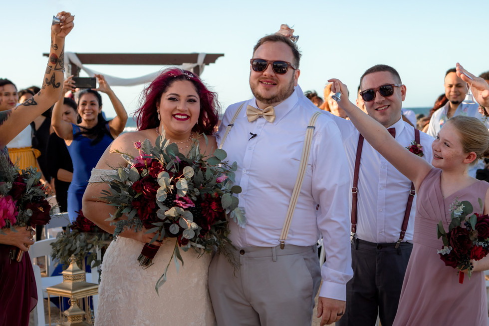 El entusiasmo creció cuando amigos y familiares tomaron asiento en esta hermosa boda en la playa. A lo largo de la costa de arena blanca, había un camino hecho de sillas y al final una pérgola magníficamente decorada. La novia lucía radiante, su cabello y su vestido bailando al viento mientras caminaba por la isla con sus padres. Cuando vislumbró a su novia acercándose a él; ¡El rostro del novio estalló en una amplia sonrisa! Finalmente se encontraron e intercambiaron votos frente a sus amigos y familiares más cercanos mientras atardecía en la playa, proporcionando un impresionante fondo para sus fotos de boda.